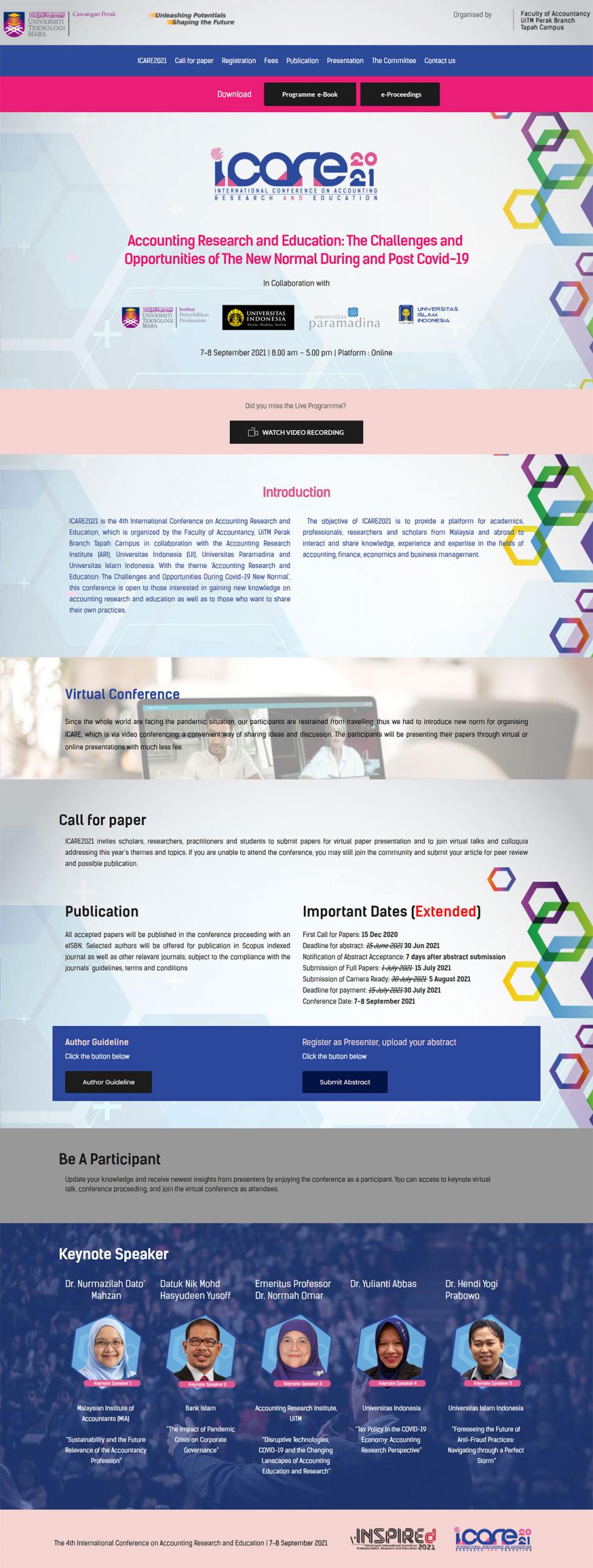 ICARE2021 is the 4th International Conference on Accounting Research and Education, which is organized by the Faculty of Accountancy, UiTM Perak Branch Tapah Campus in collaboration with the Accounting Research Institute (ARI), Universitas Indonesia (UI), Universitas Paramadina and Universitas Islam Indonesia. With the theme ‘Accounting Research and Education: The Challenges and Opportunities During Covid-19 New Normal’, this conference is open to those interested in gaining new knowledge on accounting research and education as well as to those who want to share their own practices.